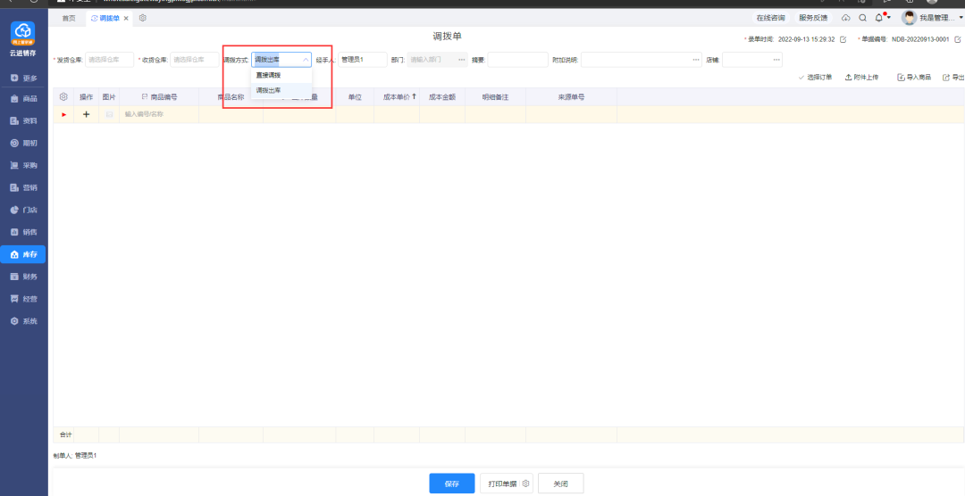 2)調(diào)撥入庫: 調(diào)撥出庫保存后,原單據(jù)上操作調(diào)撥入庫/調(diào)撥退回操作,如圖:
