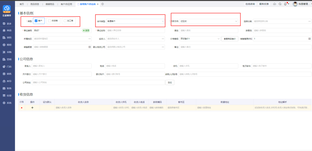 3)服務(wù)商品——支持屬性管理 商品類型為服務(wù)/勞務(wù)類商品,支持啟用屬性管理,支持啟用sku定價 4)sku條碼打印——支持打印商品自定義字段 基礎(chǔ)資料配置當中,添加了商品自定義字段后,在打印sku條碼時,自定義字段進行打印 5)商品圖片——支持查詢原圖 商品信息界面以及單據(jù)支持點擊圖片查詢原圖 6)商品導(dǎo)入——限制優(yōu)化 新增商品導(dǎo)入,支持一次導(dǎo)入10萬條商品信息,同時優(yōu)化提升導(dǎo)入效率 14、基礎(chǔ)資料——客戶/供應(yīng)商優(yōu)化 1)類型:支持多選,選項包含:客戶、供應(yīng)商、加工商 2)新增欠款方向:記應(yīng)收或記應(yīng)付 3)類型選擇客戶時,可以選擇合作類型:普通客戶or分銷商 如圖: