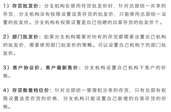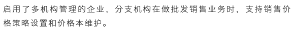 發(fā)表時間:2023-01-07 16:48 很多企業(yè)有分公司、異地辦事處、多地/多門店銷售等,多組織機構(gòu)多元化的經(jīng)營模式有時需要有不同的經(jīng)營模式以及價格策略,尤其是在批發(fā)業(yè)務(wù)上,不同的機構(gòu)在銷售價格上存在差異,這就需要各機構(gòu)獨自完成價格的設(shè)置及維護,本次T+Cloud迭代的分支機構(gòu)價格策略完美解決這個需求。 應(yīng)用場景