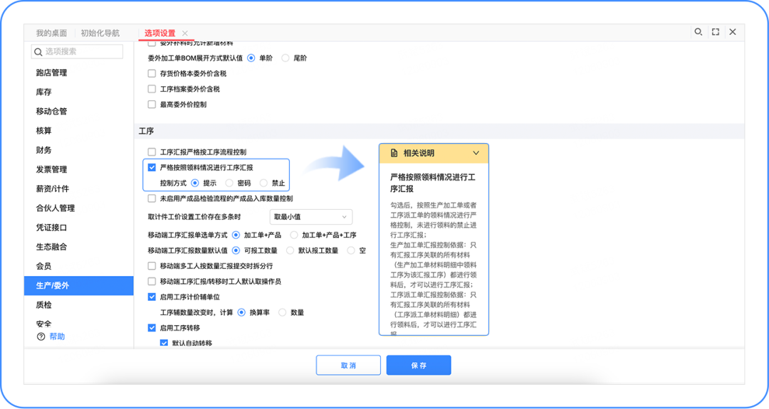 發(fā)表時間:2023-01-07 16:48 在正常生產(chǎn)業(yè)務中,工序匯報之前一般都會先進行生產(chǎn)領料,為了規(guī)范工人操作,同時避免材料遺漏,增加選項控制,增強對工人領料報工流程的約束,本次T+Cloud迭代的「工序匯報」功能解決了在領料過程中遇到的問題,一起來看看吧~ 產(chǎn)品方案