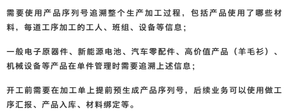發(fā)表時間:2023-01-07 16:48 序列號在眾多制造行業(yè)中廣泛應(yīng)用,如電子電器行業(yè)、汽車制造行業(yè)等,此類行業(yè)生產(chǎn)的產(chǎn)品多具有專業(yè)性強、追溯性要求高,或存在單位價值高,危險度高等特點,在生產(chǎn)、運輸、銷售和使用維護中,需要進行單品的追溯、考量和維護,并記錄單品的生命周期的要求,為了滿足制造業(yè)對序列號更精細化的應(yīng)用,本次T+Cloud迭代的「生產(chǎn)序列號」相關(guān)功能,以幫助企業(yè)實現(xiàn)智能制造。 應(yīng)用場景 場景一:質(zhì)量追溯