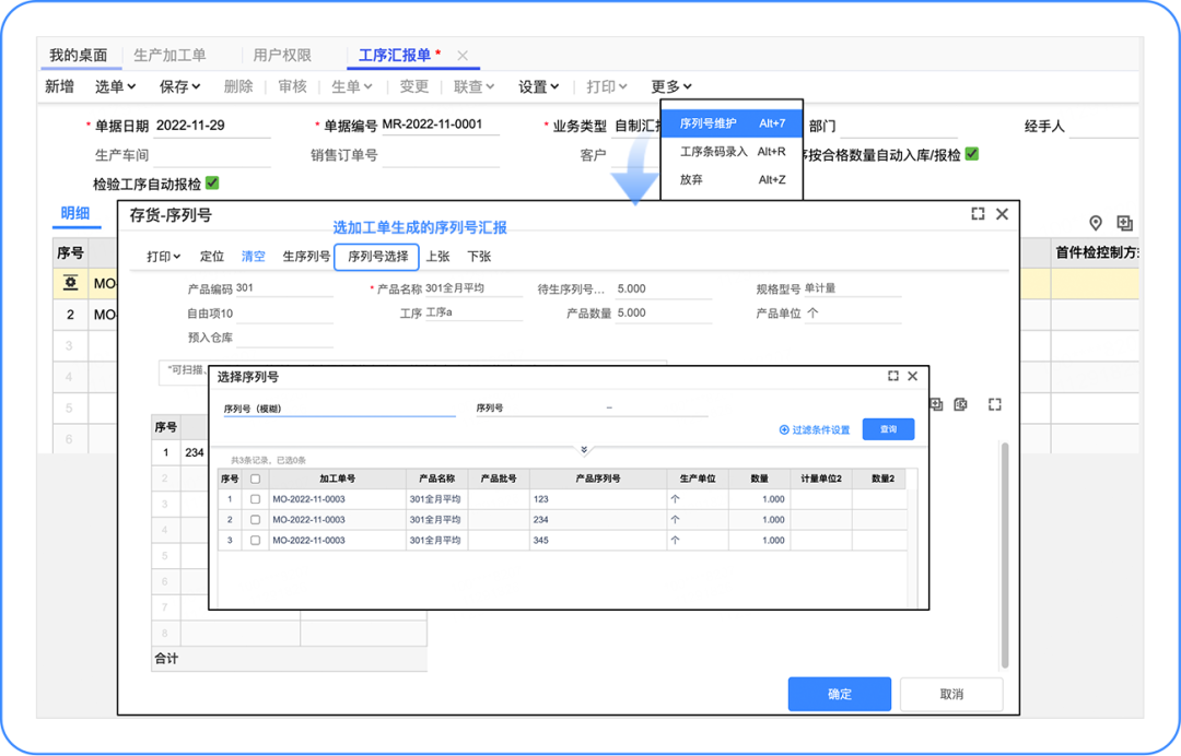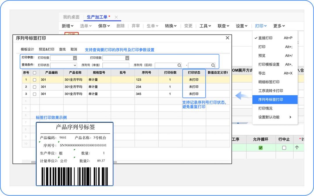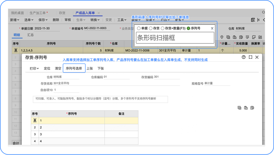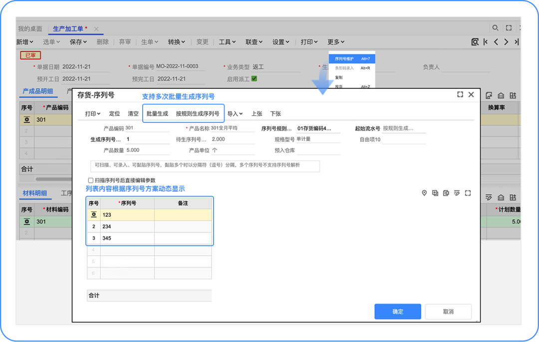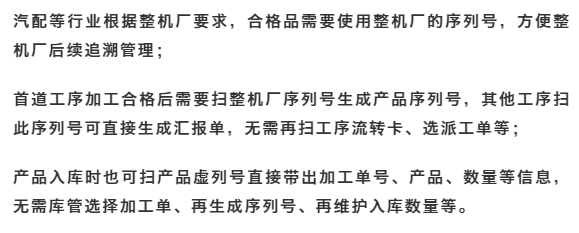 入庫后按序列號上記錄的數(shù)量回寫加工單累計入庫量。 產(chǎn)品方案 支持在加工單、匯報單多環(huán)節(jié)創(chuàng)建產(chǎn)品序列號并可打印成標(biāo)簽,后續(xù)業(yè)務(wù)可掃序列號標(biāo)簽進行匯報、入庫;匯報時還可錄入序列號數(shù)量、輔數(shù)量、自定義項等信息,入庫時自動按序列號信息帶入入庫單。 產(chǎn)品實現(xiàn) 增加選項【產(chǎn)品序列號數(shù)量合計允許大于加工單產(chǎn)品數(shù)量】,用于控制加工單生成的序列號數(shù)量能否大于加工單計劃加工數(shù)量,避免多次超額生成。 ![]() 加工單增加序列號維護功能,支持創(chuàng)建序列號。 ![]() 加工單支持序列號標(biāo)簽打,可自定義打印格式。 ![]() 加工單支持序列號創(chuàng)建權(quán)限控制。 ![]() 工序匯報單增加序列號維護功能,支持創(chuàng)建序列號,支持選擇/掃加工單生成序列號匯報,便于按序列號追溯工人、設(shè)備等信息。 ![]() 入庫單支持選擇/掃加工單生成序列號入庫,并帶入加工單號、產(chǎn)品、序列號上的數(shù)量等屬性信息。 ![]() 注:使用序列號追溯生產(chǎn)過程人、機、料等信息報表暫不支持,后續(xù)在質(zhì)量追溯模塊中提供。 以上就是「生產(chǎn)序列號」功能的迭代。 更多用友軟件操作問題,可以聯(lián)系梁老師18110593406 長按識別二維碼添加好友,及時解答 點分享 點收藏 點點贊 點在看 |