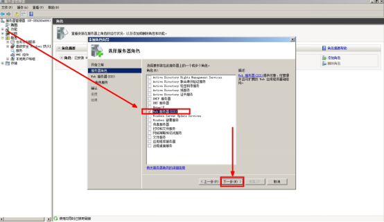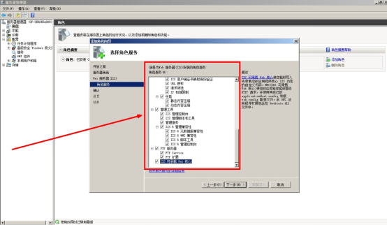 4、在進入角色服務(wù)后將角色服務(wù)列表上的項目全部選擇,不能有遺漏;【角色服務(wù)】列表上一定要逐個檢查并全部勾選