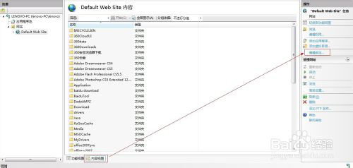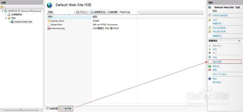 11、然后再來設置高級設置,步驟:先點擊default web site,然后點擊最下面的內容視圖,再點擊右邊的高級設置。