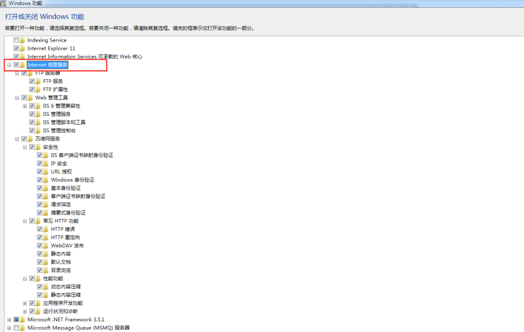 3、進入Windows功能窗口,然后看到internet信息服務選項,把下面的內容全部勾選上安裝使用