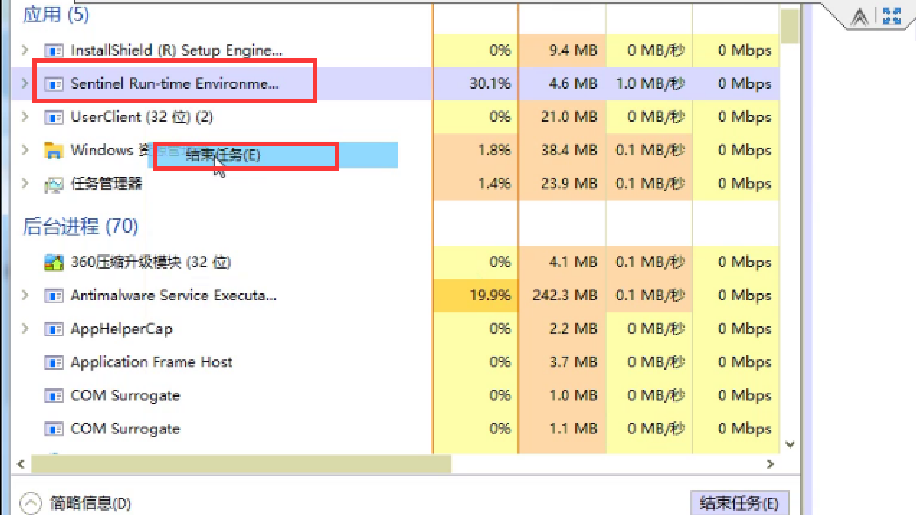 安裝軟件前啟用下任務管理,安裝到100% 立即 將Sentinel開頭的進程結(jié)束下