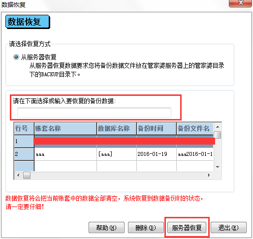 數(shù)據(jù)恢復(fù) 輝煌版 登陸到軟件里面后 在系統(tǒng)維護下---數(shù)據(jù)恢復(fù) 輸入你要恢復(fù)的備份的文件名稱(當時手動備份輸入的名稱) 輸入完后點擊服務(wù)器恢復(fù),等待恢復(fù)成功即可 如圖:
