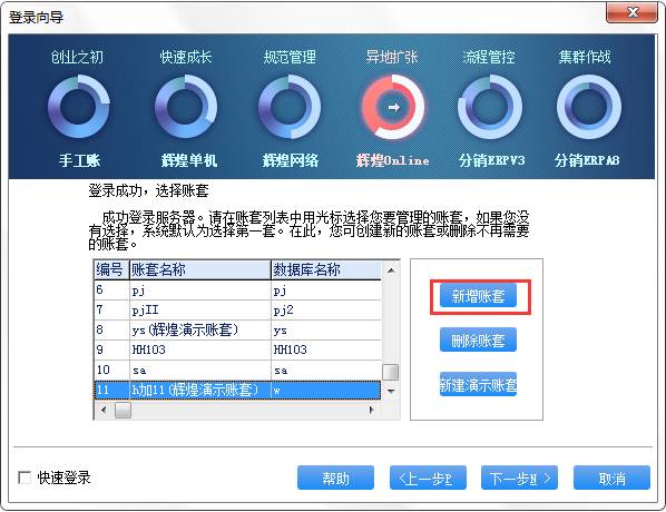 新建賬套 輝煌版 登錄軟件雙擊后,在選擇賬套界面如圖: 點擊新增賬套