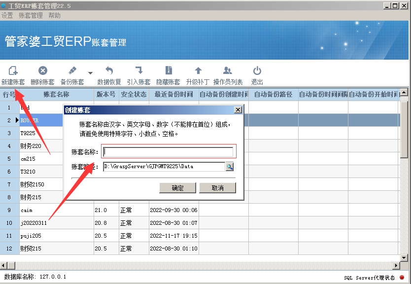 輸入系統(tǒng)管理員賬號:sa 系統(tǒng)管理員密碼:安裝數(shù)據(jù)庫是添加的密碼 賬套名稱:自己創(chuàng)建,例如公司名稱 數(shù)據(jù)庫名稱:賬套名稱的英文縮寫(必須是英文的) ![]() 財貿(mào)版 如版本是財貿(mào)雙全15.8以下的版本,可參考上方輝煌版新建賬套步驟 財貿(mào)雙全的15.8及以上版本:進入軟件后右上角賬套管理新建賬套 需在軟件服務(wù)器主機操作新建賬套