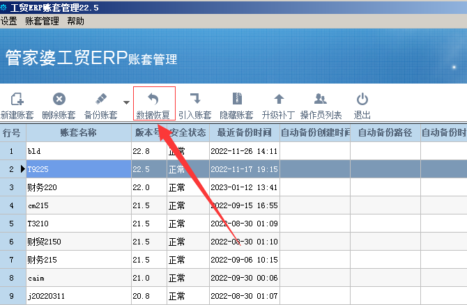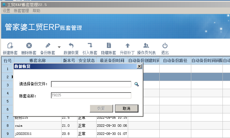 財貿(mào)雙全的13.5以下: 登陸軟件后點擊左上角文件下---恢復(fù) 輸入你要恢復(fù)的備份的文件名(當時手動備份文件自己留的名稱)