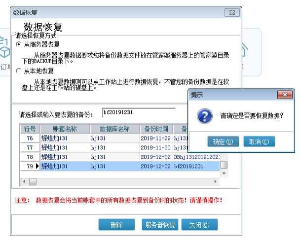 4、進入2023年賬套,系統(tǒng)維護---數(shù)據(jù)恢復--服務器恢復--選擇剛才備份的數(shù)據(jù),雙擊----點擊服務器恢復----確定---確認恢復成功;進入即可。