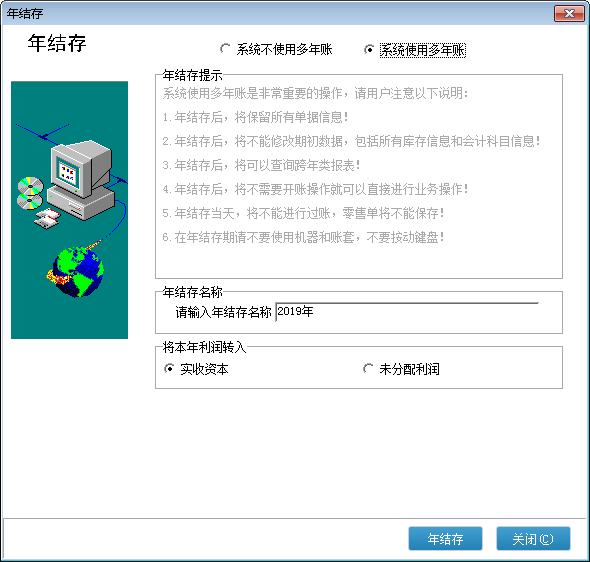 5、登錄管家婆軟件進入2023年賬套,做年結存,系統(tǒng)維護---選擇系統(tǒng)使用多年賬---年結存,如果提示備份,可以跳過。