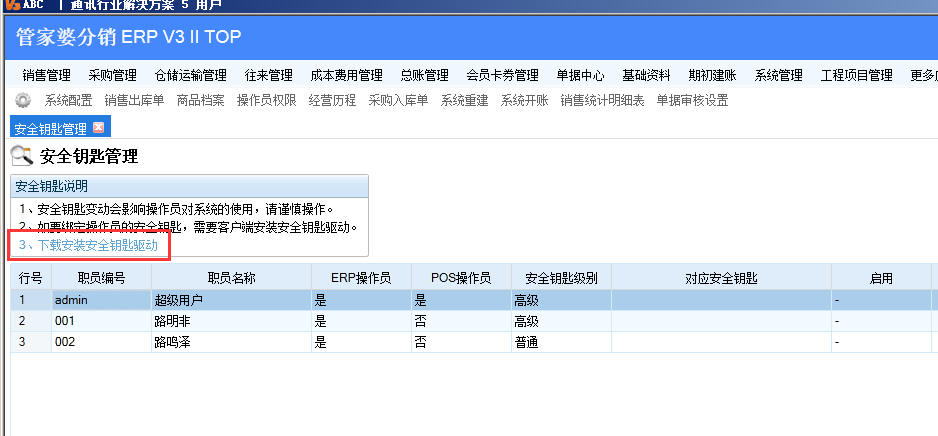 2、安全鑰匙使用步驟 ①、綁定操作員; ②、啟用安全鑰匙; ③、登陸系統(tǒng)之前在使用的電腦上插入安全鑰匙; ④、錄入操作員名稱、密碼進入分銷系統(tǒng)。 注意: 1、安全鑰匙分兩類,一類是高級鑰匙,一類是普通鑰匙。 2、如果操作員權(quán)限中包括系統(tǒng)重建、系統(tǒng)配置、年結(jié)存這三個權(quán)限之一,那么該操作員就只能綁定高級鑰匙。 3、如果操作員權(quán)限中不包括上述三個權(quán)限之一,那么該操作員既可綁定高級鑰匙,也可綁定普通鑰匙。 4、在同一個賬套里面,同一個賬號或者同一個安全鑰匙,都是唯一的,只能一個操作員綁定一個安全鑰匙,也就是說:只能一對一,不能一對多或者多對一,但是同一個鑰匙,可以在多個賬套使用。 3、安全鑰匙使用方法 下面以給操作員“路明非”配置安全鑰匙為例: 第一步:安裝安全鑰匙驅(qū)動 如果是第一次進行綁定,那么首先應(yīng)該安裝一個安全鑰匙的驅(qū)動程序。 在“安全鑰匙說明”中的第三項,點擊下載安全鑰匙的驅(qū)動程序。下載之后,按提示進行安裝。安全鑰匙驅(qū)動可以再安全鑰匙管理點擊下載安全鑰匙驅(qū)動安裝,也可以在下面提供的鏈接下載這個安全鑰匙驅(qū)動安裝 http://pan.baidu.com/s/1eSfquQ2 注意:9.4以后新安全鑰匙識別不了新驅(qū)動
