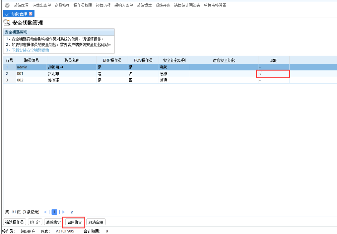 第三步:啟用安全鑰匙 在綁定了安全鑰匙之后,如果沒有啟用,操作員仍然可以不用安全鑰匙就可以登陸系統(tǒng)。 引入安全鑰匙的啟用功能,主要是考慮到:在使用安全鑰匙的用戶中,有些操作員在外地辦公,而安全鑰匙需要在總部綁定之后才能通過郵寄或其他方式發(fā)到操作員的手中。郵寄的這個時間中,不能影響到外地操作員的正常辦公?,F(xiàn)在,可以先在總部綁定操作員與安全鑰匙,待操作員收到安全鑰匙后,再由超級用戶將安全鑰匙啟用即可。 或要啟用安全鑰匙,只需要選定操作員,然后點啟用綁定按鈕即可。如果要取消啟用,點取消啟用按鈕即可。