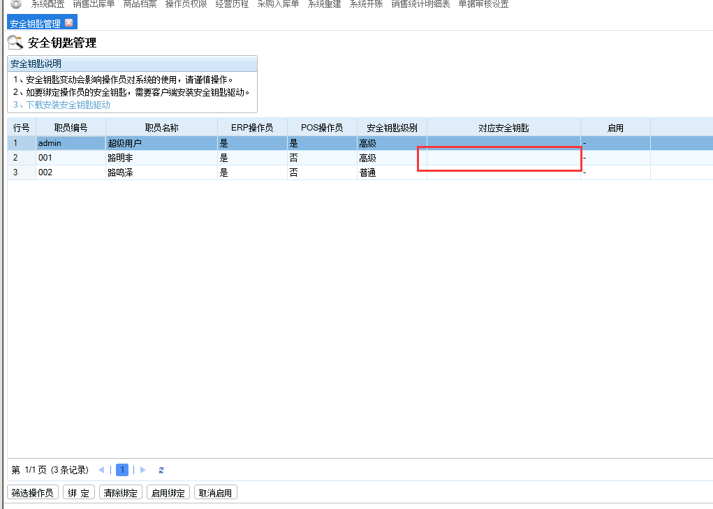 第二步:綁定操作員 只有超級用戶才能對操作員進行安全鑰匙的配置操作。 超級用戶先將安全鑰匙插入主機中,再選定操作員“路明非”,然后點擊按鈕綁定,根據(jù)提示進行綁定。 綁定時,要按照“安全鑰匙級別”中操作員對應(yīng)安全鑰匙的級別來綁定?!鞍踩€匙級別”為“高級”的操作員,只能綁定“高級鑰匙”;安全鑰匙級別為“普通”的操作員,可以綁定“高級鑰匙”和“普通鑰匙”。 一個安全鑰匙只能綁定一個操作員,驅(qū)動安裝軟件操作綁定以后對應(yīng)安全鑰匙會顯示顯示安全鑰匙的串號。