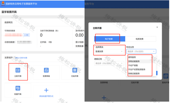 PS:納稅人首次開票的,可以先進(jìn)行【開票信息維護(hù)】: 《【實(shí)用】全電發(fā)票實(shí)用功能之開票項(xiàng)目信息維護(hù)》三、選擇【立即開票】——【電子發(fā)票】,選擇開票類型【增值稅專用發(fā)票/普通發(fā)票】,并根據(jù)需要選擇【特定業(yè)務(wù)】。如下圖: