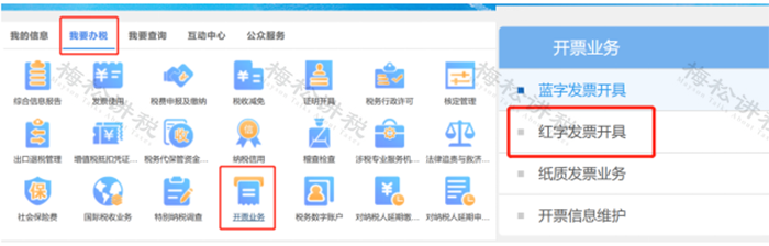 全電發(fā)票如何紅沖? 情形一:開票方開具全電發(fā)票后,受票方未做用途確認(rèn)及入賬確認(rèn)的,開票方在電子發(fā)票服務(wù)平臺(tái)填開《紅字發(fā)票信息確認(rèn)單》后全額開具紅字全電發(fā)票,無需受票方確認(rèn)。 具體操作步驟如下: 一、登錄電子稅務(wù)局,【我要辦稅】——【開票業(yè)務(wù)】——【紅字發(fā)票開具】。如下圖: