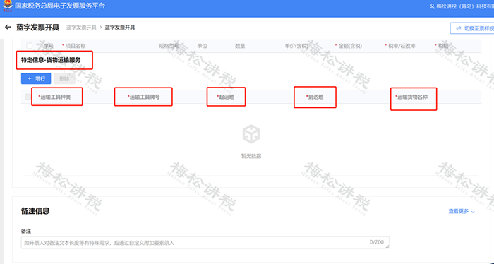 (3)填寫【特定信息】:貨物運(yùn)輸服務(wù)的特定信息,需要填報(bào)【運(yùn)輸工具種類】【運(yùn)輸工具牌號】【起運(yùn)地】【到達(dá)地】【運(yùn)輸貨物名稱】。如下圖: