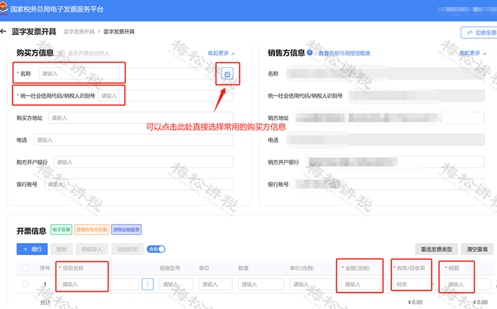 四、以下我們以“貨物運(yùn)輸服務(wù)增值稅專票”為例,來說明一下發(fā)票開具的信息填寫步驟: (1)填寫【購買方信息】:開具增值稅專用發(fā)票的,【名稱】和【統(tǒng)一社會(huì)信用代碼/納稅人識(shí)別號】為必填項(xiàng);開具普通發(fā)票的,僅【名稱】為必填項(xiàng)。 (2)填寫【開票信息】:【項(xiàng)目名稱】【金額(含稅)】【稅率/征收率】【稅額】四項(xiàng)為必填項(xiàng)。