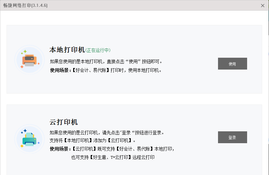 ②打印插件安裝好后會(huì)顯示暢捷通網(wǎng)絡(luò)打印助手圖標(biāo)可以選擇以下兩種方式來(lái)打印憑證: 方式一:在本地顯示了暢捷通網(wǎng)絡(luò)打印助手后,需要手動(dòng)雙擊鼠標(biāo)點(diǎn)擊一下暢捷通網(wǎng)絡(luò)打印助手的圖標(biāo),選擇【本地打印機(jī)】點(diǎn)擊使用按鈕后,即插件自動(dòng)運(yùn)行在桌面的右下角;