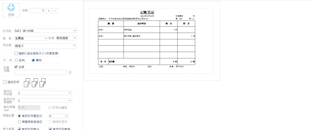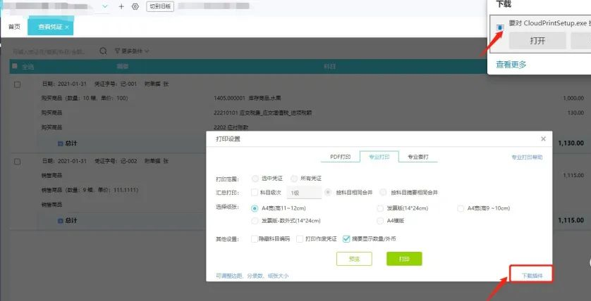 2. 舉專(zhuān)業(yè)版打印發(fā)票紙張為例:選中憑證為:2021-10-19,憑證號(hào):005,點(diǎn)擊右上角【打印】按鈕,選擇專(zhuān)業(yè)打印,發(fā)票版進(jìn)行打印憑證,具體操作如下: ①如果是第一次且選擇的是專(zhuān)業(yè)打印/專(zhuān)業(yè)套打進(jìn)行打印憑證時(shí),需要點(diǎn)擊右下角的【打印插件】,進(jìn)行下載網(wǎng)絡(luò)打印助手或點(diǎn)擊最下面的【預(yù)覽】界面下載插件都可以;