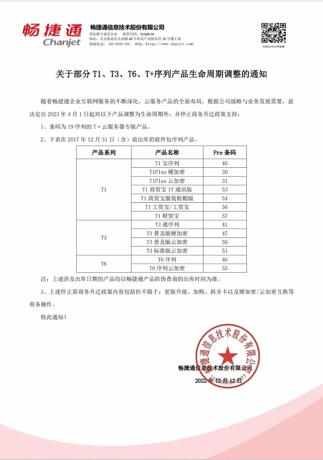 發(fā)表時間:2023-05-23 18:05作者:小管君 關(guān)于部分 T1、T3、T6、T+序列產(chǎn)品 生命周期調(diào)整的通知 隨著暢捷通企業(yè)互聯(lián)網(wǎng)服務的不斷深化,云服務產(chǎn)品的全面布局,根據(jù)公司戰(zhàn)略與業(yè)務發(fā)展需要,茲決定自2023年4月1日起對以下產(chǎn)品調(diào)整為生命周期外,并停止商務升遷政策支持: 1、條碼為19序列的T+云服務器專版產(chǎn)品。 2、下表在2017年12月31日(含)前出庫的軟件包序列產(chǎn)品。 ![]() 注:上述涉及出庫日期的產(chǎn)品均以暢捷通產(chǎn)品防偽查詢的出庫時間為準。 3、上述停止原商務升遷政策內(nèi)容包括但不限于:更版升級、加購、拆并卡以及硬加密/云加密互換等商務操作。 特此通知! ![]()