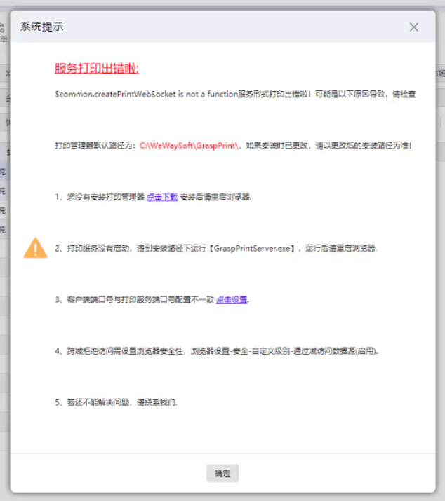 在打印報(bào)表或單據(jù)時(shí),管家婆財(cái)/工貿(mào)(b/s網(wǎng)頁版)系列產(chǎn)品中有時(shí)會(huì)遇到個(gè)別提示,如:端口占用、打印功能無法使用等。面對(duì)這類提示,我們?cè)撊绾慰焖儆行У剡M(jìn)行處理呢? 常見提示 提示一: ![]() 提示二: ![]() 提示三: ![]() 原因分析 1、打印服務(wù)沒有啟動(dòng); 2、打印端口被占用; 3、防護(hù)軟件攔截了打印服務(wù)啟動(dòng)或端口訪問; 4、瀏覽器兼容性問題導(dǎo)致。 解決方案 1、關(guān)閉防火墻殺毒軟件; 2、啟動(dòng)打印服務(wù),啟動(dòng)后在右下角查看打印服務(wù)圖標(biāo)是否顯示,參考截圖: ![]() 3、檢查打印服務(wù)端口是否有被占用,建議修改打印服務(wù)端口,修改websockrt端口號(hào),改成未被使用過的端口。一般建議在8000-9999范圍內(nèi),前面的HTTP端口號(hào)不用改,修改后重啟電腦; 檢查端口被占用方法: https://pan.baidu.com/s/1M0ahQq32t4PgwMdS4F-J1w 提取碼: 2qav 4、檢查電腦上是否安裝有金山毒霸、拼多多或其他打印組件,如有安裝請(qǐng)卸載。同時(shí),卸載管家婆打印管理器并重新安裝。 5、推薦使用360極速瀏覽器。 更多管家婆軟件操作問題,可以聯(lián)系梁老師17374708361 長(zhǎng)按識(shí)別二維碼添加好友,及時(shí)解答 |