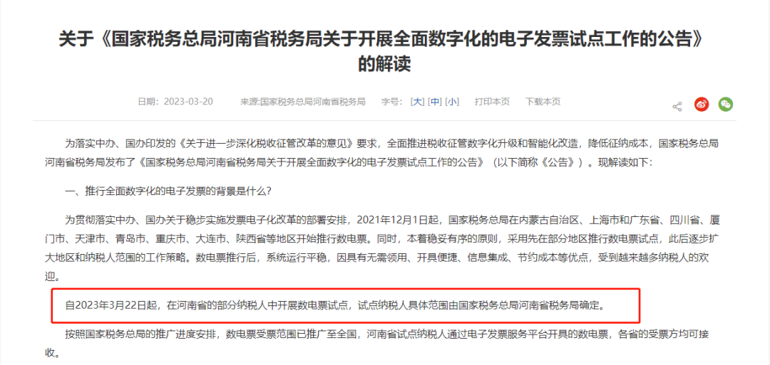 傳統(tǒng)的發(fā)票制度在接連不斷的信息化沖擊中尋求發(fā)展,發(fā)票電子化的理念也就此而生。2017年3月,國家稅務(wù)總局發(fā)布了推廣電子普通發(fā)票的指導(dǎo)意見,對(duì)電子發(fā)票推行的總體工作等進(jìn)行了明確,提出重點(diǎn)在電商、電信、金融、快遞、公用事業(yè)等行業(yè)推行使用電子發(fā)票。電子發(fā)票的推廣應(yīng)用,標(biāo)志著我國發(fā)票管理體制出現(xiàn)了根本性的變革。 數(shù)字經(jīng)濟(jì):新技術(shù)吹來的“票據(jù)電子化”東風(fēng) 數(shù)字經(jīng)濟(jì)的爆發(fā)式增長,使得財(cái)稅領(lǐng)域數(shù)字化轉(zhuǎn)型需求將日益強(qiáng)烈,為了提升企業(yè)效率、降低社會(huì)成本,真正實(shí)現(xiàn)“以數(shù)控稅”,國家進(jìn)一步規(guī)范和擴(kuò)大電子發(fā)票的使用。 2019年,國家稅務(wù)總局建設(shè)全國統(tǒng)一的電子發(fā)票公共服務(wù)平臺(tái),為納稅人提供電子發(fā)票開具等基本公共服務(wù)。 2020年,將增值稅發(fā)票選擇確認(rèn)平臺(tái)升級(jí)為增值稅發(fā)票綜合服務(wù)平臺(tái),同時(shí)明確了納稅人通過增值稅電子發(fā)票公共服務(wù)平臺(tái)開具的增值稅電子普通發(fā)票為OFD格式。 2021年,在上海市、廣東省、內(nèi)蒙古自治區(qū)三地部分地區(qū)的部分納稅人中開展全電發(fā)票試點(diǎn)工作,通過全國統(tǒng)一的電子發(fā)票服務(wù)平臺(tái)24小時(shí)在線免費(fèi)為納稅人提供全電發(fā)票的開具、交付、查驗(yàn)等服務(wù),試點(diǎn)范圍包括存量企業(yè),我國電子發(fā)票試點(diǎn)進(jìn)入“全面數(shù)字化”和“一票式”集成階段。 2022年,受票方試點(diǎn)省市計(jì)劃單列市累計(jì)36個(gè)。 2023年,試點(diǎn)工作再擴(kuò)圍,河南省電票開票成為試點(diǎn)省份