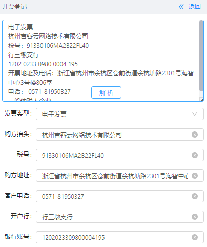 5)一鍵解析開票信息,開票涉及的地址、稅號、賬號等信息復(fù)雜,吉客云客服助手里支持一鍵解析,讓信息錄入更便捷準(zhǔn)確。