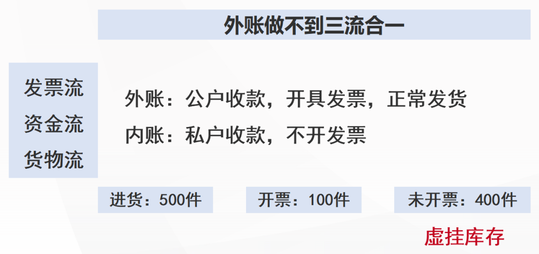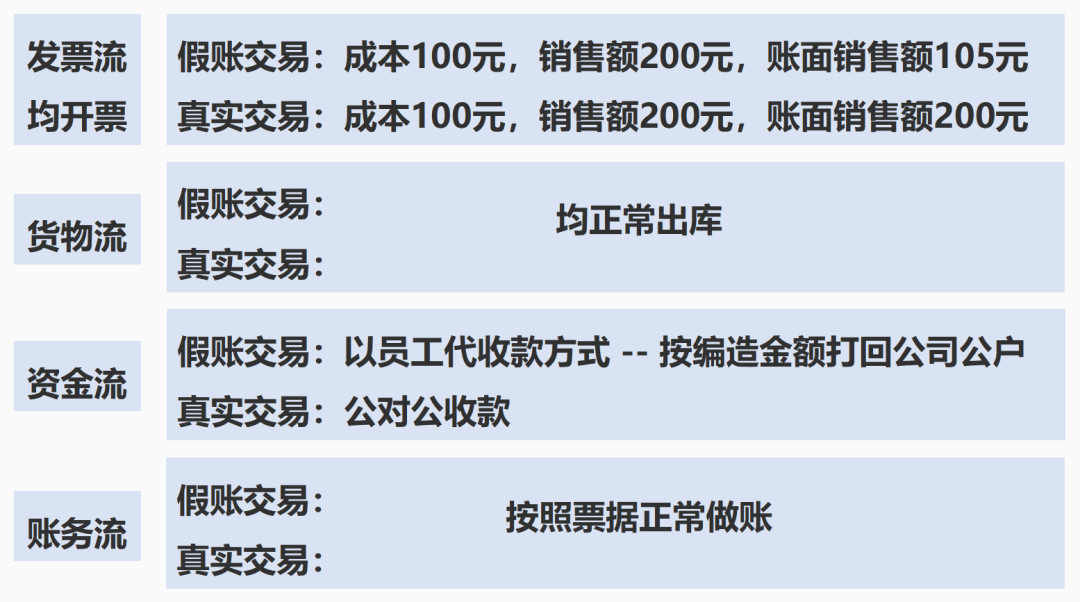 很多企業(yè)存在著假賬、內(nèi)外賬的情況,隨著金稅四期的不斷完善,以下情形可不能再有了! 一些企業(yè)為了方便報稅,干脆造了一套“假賬”出來。在面向個人/個體戶的交易中,對方不需要發(fā)票,有“假賬”制造的土壤。 如下圖所示,“假賬”完全符合四流合一的要求,發(fā)票流、賬務流、資金流和貨物流全部都對的上。