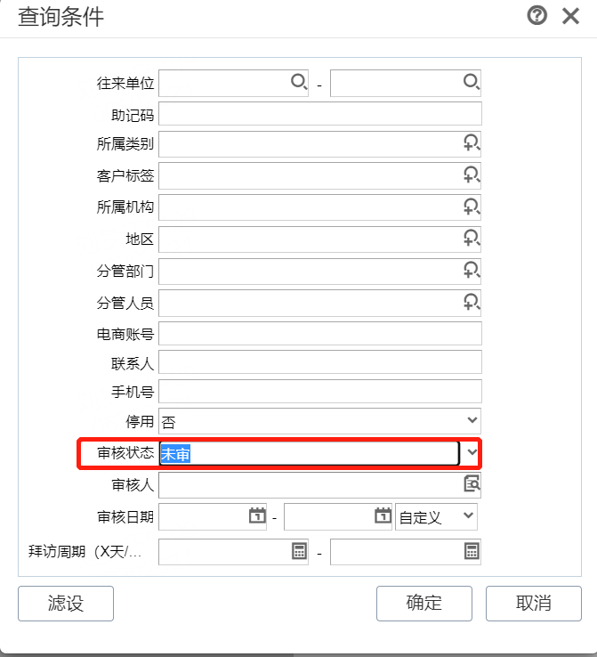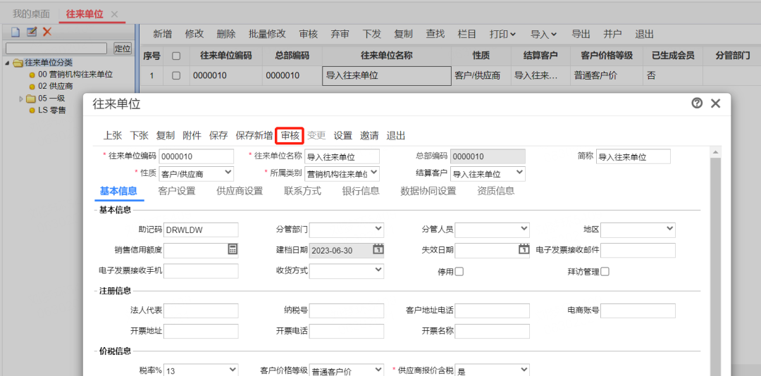 2、在【基礎(chǔ)設(shè)置】-【往來(lái)單位】檔案中點(diǎn)擊【查找】選擇【審核狀態(tài)】未審后,即可查到剛導(dǎo)入的往來(lái)單位檔案
