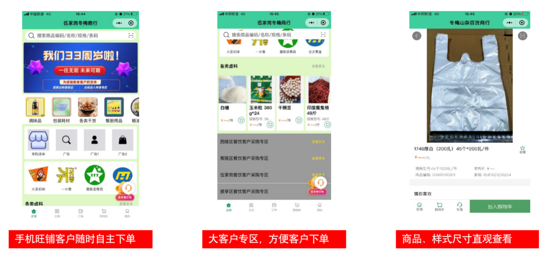 業(yè)務(wù)難點(diǎn)3:受業(yè)務(wù)人員文化水平、系統(tǒng)便利性、客戶線上下單等因素影響,大部分銷售開單錄單工作都集中在老板娘身上,老板娘工作量大。部分商品客戶需要看圖片,要了解商品多個具體尺寸與規(guī)格,需要與業(yè)務(wù)人員反復(fù)溝通,溝通成本高。業(yè)務(wù)員平均負(fù)責(zé)客戶量較大,重點(diǎn)大客戶服務(wù)響應(yīng)及時性不夠。解決方案:開通好業(yè)財(cái)旺鋪商城,引導(dǎo)客戶自主在線下單,老板僅需在后臺進(jìn)行審核,無需二次錄單輕松銷售,旺鋪開設(shè)大客戶常購專區(qū),大客戶快速選購自己常購商品不需要再反復(fù)篩選下單,方便客戶在線下單;將商品詳情圖上傳至商城,客戶便捷了解所需購買商品尺寸與規(guī)格無需反復(fù)溝通確認(rèn)。