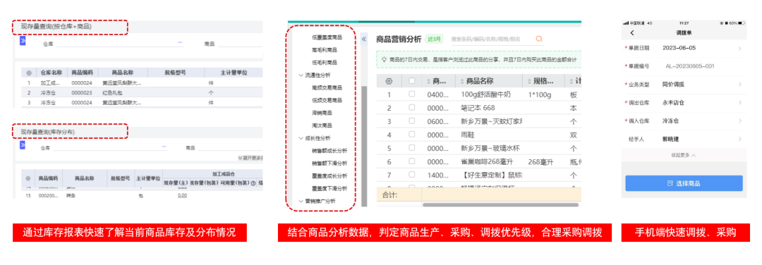 業(yè)務(wù)難點(diǎn)4:倉儲配送管理難。生產(chǎn)廠房在異地不能及時掌握門店庫存情況,生產(chǎn)、送貨數(shù)量不好把握,商品缺貨或庫存積壓問題易出現(xiàn)。客戶有四個發(fā)貨倉庫,業(yè)務(wù)員開單后需要將發(fā)貨單送給倉管人員進(jìn)行揀貨發(fā)貨,發(fā)貨效率慢,溝通成本高。解決方案:(1)客戶通過好業(yè)財(cái)庫存分布表、現(xiàn)存量表以及商品分析、智能補(bǔ)貨功能可以快速制定商品生產(chǎn)、調(diào)撥、采購計(jì)劃。通過好業(yè)財(cái)手機(jī)端可快速完成商品采購、調(diào)撥等業(yè)務(wù)操作。