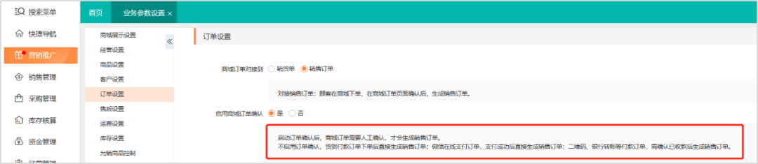 04 不啟用訂單確認(rèn),貨到付款訂單下單后直接生成銷(xiāo)售訂單;微信在線支付訂單,支付成功后直接生成銷(xiāo)售訂單;二維碼、銀行轉(zhuǎn)賬等付款訂單,需確認(rèn)已收款后生成銷(xiāo)售訂單。