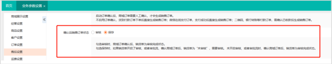 05 勾選保存時(shí),如果銷(xiāo)貨單開(kāi)啟了審核或者審批流,確認(rèn)商城訂單后,銷(xiāo)貨單為“未審核”,需要再去操作審核。未開(kāi)啟審核,確認(rèn)商城訂單后,銷(xiāo)貨單為審核完成狀態(tài)。