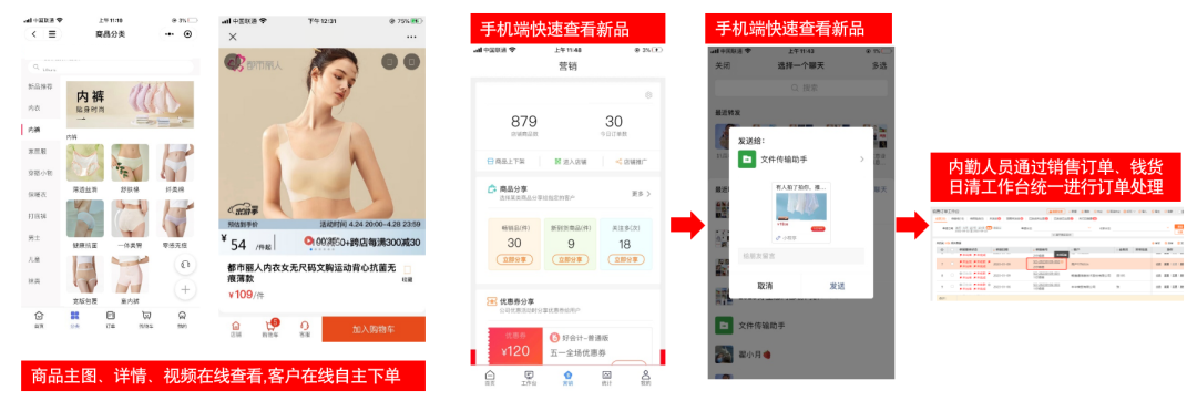商品上新、更新快,客戶下單需要看品,公司上新后業(yè)務(wù)員發(fā)新品到朋友圈或私信客戶,工作量大效率低,客戶下單主要通過微信、電話形式,溝通成本高,效率低。