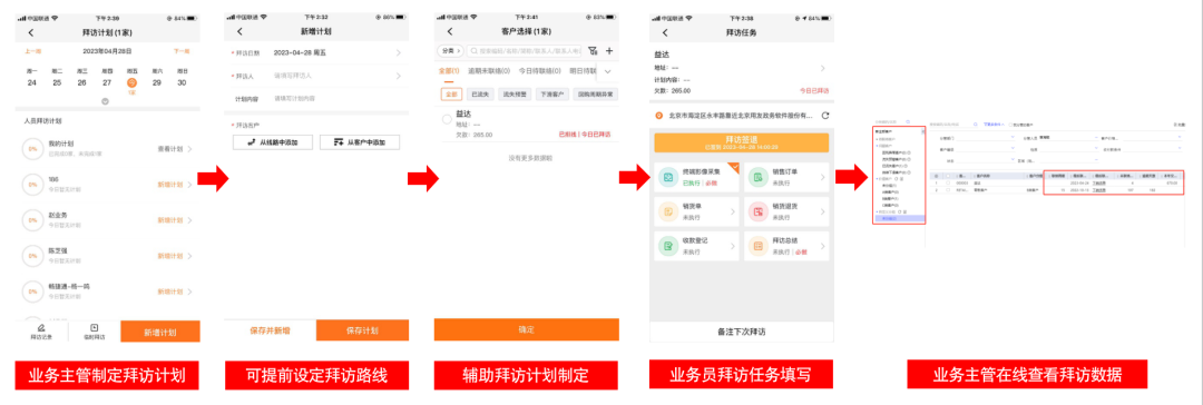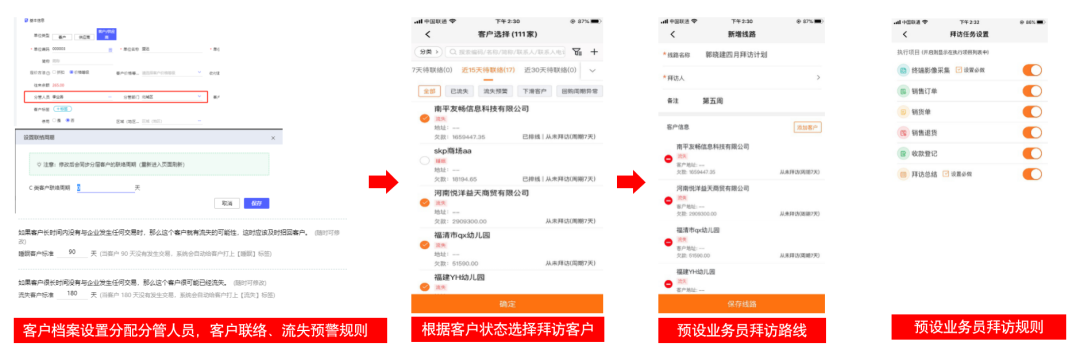 客戶檔案內(nèi)為客戶分配分管業(yè)務(wù)員及分管部門,責(zé)任到人。設(shè)定客戶聯(lián)絡(luò)周期天數(shù)、流失預(yù)警天數(shù)、睡眠預(yù)警天數(shù)對客戶狀態(tài)進(jìn)行分層管理。業(yè)務(wù)主管根據(jù)客戶狀態(tài)為業(yè)務(wù)員設(shè)定客戶拜訪計劃、拜訪打卡規(guī)則,指導(dǎo)業(yè)務(wù)員拜訪動作。業(yè)務(wù)員按規(guī)定完成客戶拜訪,在手機(jī)端填報拜訪日志,業(yè)務(wù)主管通過客戶報表快速掌握客戶聯(lián)絡(luò)執(zhí)行情況。