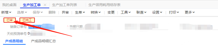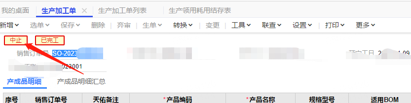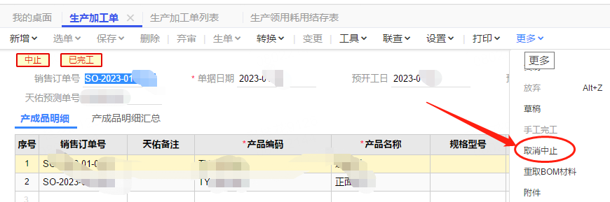 2、將【生產(chǎn)加工單】是(中止)完工的單據(jù)狀態(tài)調(diào)整掉,取消中止即可