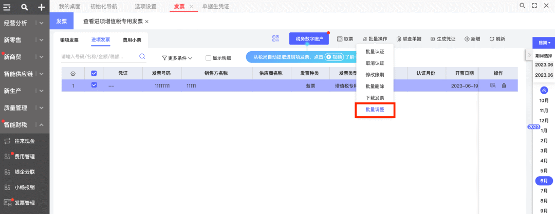 【應(yīng)用場(chǎng)景】提取發(fā)票后,需要將發(fā)票抬頭/商品與往來(lái)單位/存貨檔案匹配,以便: 可按檔案查詢發(fā)票; 進(jìn)項(xiàng)發(fā)票與采購(gòu)單據(jù)可自動(dòng)勾稽; 發(fā)票生憑證時(shí),檔案可自動(dòng)寫入科目輔助核算。 【解決方案】 支持三種匹配方式:發(fā)票-手工匹配 在發(fā)票列表界面,選擇發(fā)票,點(diǎn)擊批量操作-批量調(diào)整-供應(yīng)商,手工匹配往來(lái)單位檔案;