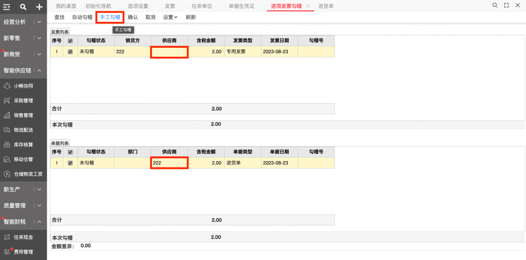 勾稽-手工匹配 在進(jìn)項(xiàng)發(fā)票勾稽界面,選擇供應(yīng)商為空的發(fā)票,與單據(jù)做手工勾稽,手工匹配往來(lái)單位檔案;