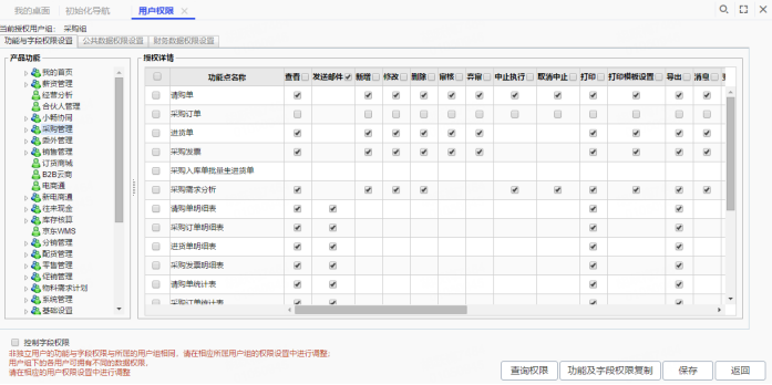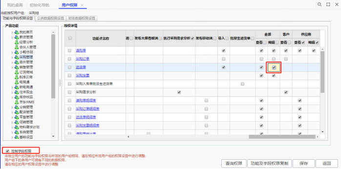 2. 勾選控制字段權(quán)限,找到進貨單的金額列,勾選編輯后保存。