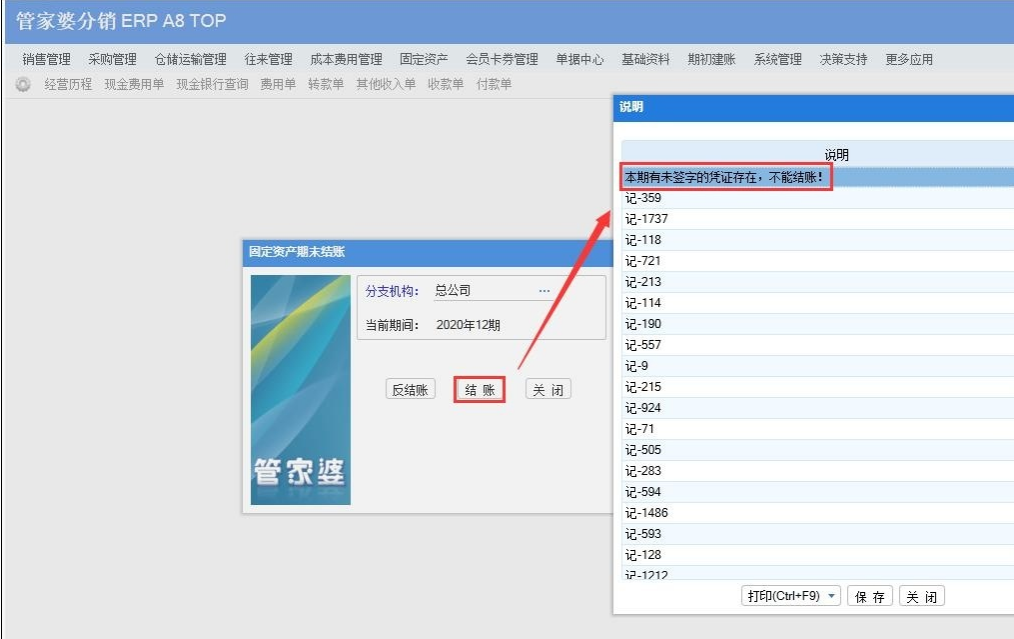 摘要:當(dāng)總賬模塊進(jìn)行期末結(jié)賬的時候,時常出現(xiàn)各種提示,導(dǎo)致不能結(jié)賬成功。一起來了解下分銷ERP A\V系列軟件,總賬期末結(jié)賬的常見問題及處理方法。 ![]() 處理方法: 1、總賬管理——結(jié)賬——【結(jié)轉(zhuǎn)損益】里面對損益類科目做結(jié)轉(zhuǎn)損益后,并且對結(jié)轉(zhuǎn)損益產(chǎn)生的憑證做審核記賬后,再做期末結(jié)賬即可。 2、如果做期末結(jié)賬不強(qiáng)制要求要做結(jié)轉(zhuǎn)損益的話,到【賬務(wù)參數(shù)】里面可以取消【結(jié)賬時要求損益類科目余額為0】配置。 ![]() 處理方法: 1、如果客戶用的是非總賬版本,需要將軟件變成總賬版本,在總賬管理——財務(wù)參數(shù)——【記賬后出納簽字】的配置取消打鉤,再將軟件變成非總賬版本,做期末結(jié)賬即可。 2、如果客戶用的是總賬版本,不需要簽字的話,也可以將總賬管理——財務(wù)參數(shù)——【記賬后出納簽字】的配置取消后再做期末結(jié)賬,需要簽字的話到總賬管理——憑證處理——【出納簽字】做簽字后再做期末結(jié)賬。 ![]() 處理方法: 1、看看是否在賬務(wù)期初里面錄入了輔助核算項目的科目余額,并且只對總賬模塊開賬了,業(yè)務(wù)模塊沒有開賬,如果是該現(xiàn)象的話,將業(yè)務(wù)模塊開賬后,再做期末結(jié)賬即可。 2、如果不是上述現(xiàn)象的話,就到會計憑證查詢里面做總賬數(shù)據(jù)修復(fù),9.6及其以上版本新增了總賬數(shù)據(jù)修復(fù)的功能。