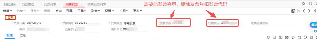 3、如果需要對之前的開票單據(jù)(銷售發(fā)票)重新開具,需要找到之前的銷售發(fā)票,刪除開錯的發(fā)票代碼和發(fā)票號碼,刪除后保存審核后再點擊【開票】重新開票。
