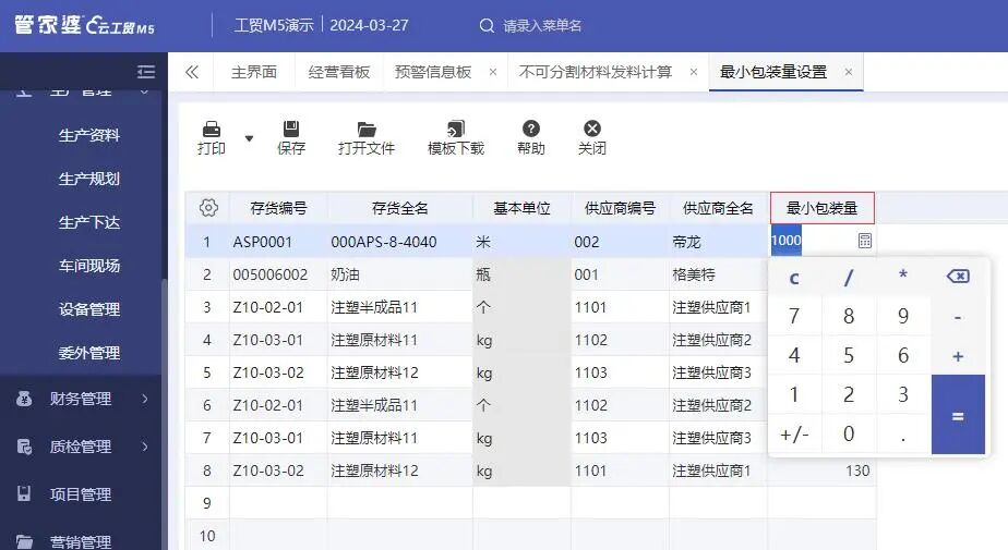 我們可以在系統(tǒng)中設置某個商品或者材料的最小包裝量,之后的采購、領用就會按照這個用量的