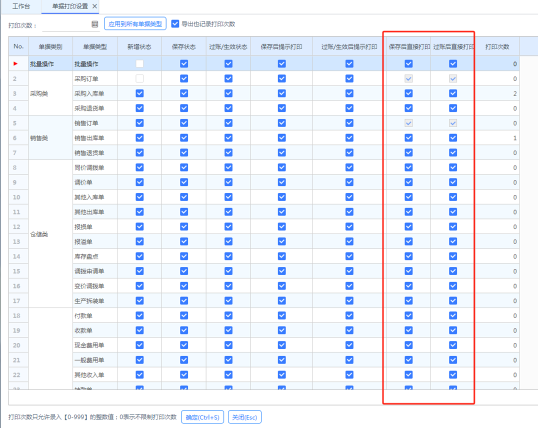 1、商品選擇器新增【不顯示庫(kù)存為零】的商品選項(xiàng)。 2、新增顯示庫(kù)存明細(xì)的選項(xiàng),勾選后可顯示庫(kù)存具體分布及批次明細(xì);且可錄入數(shù)量后自動(dòng)帶入相關(guān)信息到明細(xì)行。 3、此功能僅旗艦版支持。 ![]() 1、增加打印端口設(shè)置及記憶。 2、新增打印設(shè)置,支持保存或過(guò)賬后直接打印,不再?gòu)椏蛱崾尽?/span> ![]()