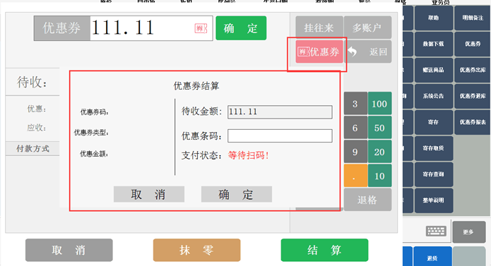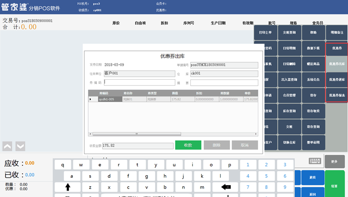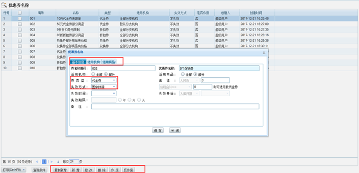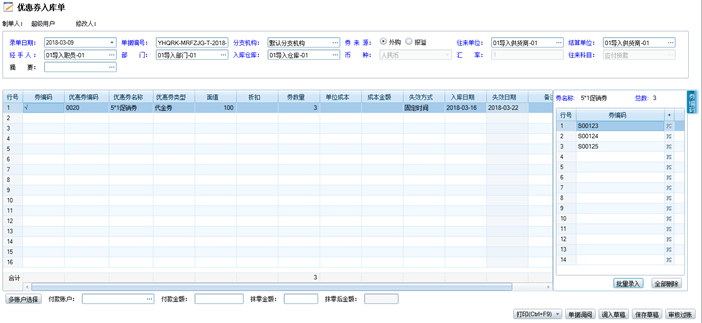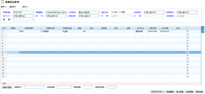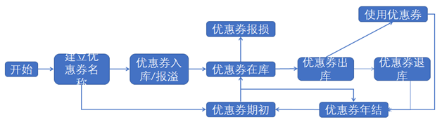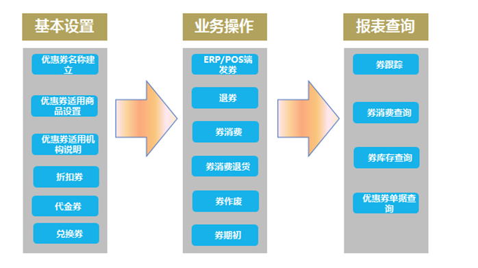 03 優(yōu)惠券功能說明 一:總體說明: 1、目前支持優(yōu)惠券從名稱建立到入庫、出庫、消費(fèi)、消費(fèi)退貨、消費(fèi)紅沖、券作廢、年結(jié)存等一系列業(yè)務(wù); 2、優(yōu)惠券支持在ERP端和POS端的發(fā)券、消費(fèi); 3、優(yōu)惠券名稱建立時(shí),支持設(shè)置適用分支機(jī)構(gòu)和適用商品;對(duì)應(yīng)券名稱可實(shí)現(xiàn)單據(jù)有效金額達(dá)到多少后才能使用的設(shè)置; 4、券過期后不能消費(fèi),但是在優(yōu)惠券出庫、入庫、盤點(diǎn)、消費(fèi)退貨時(shí)是可以正常處理的。 二:券狀態(tài)說明: