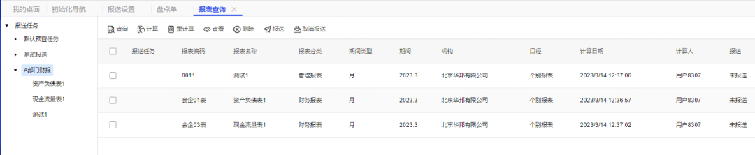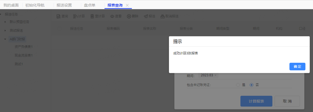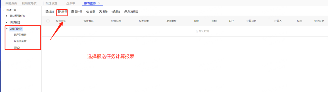 報表查詢界面選擇A部門財報進行計算,會自動計算生成任務下的所有報表,如果只想計算某一張報表可以選擇任務下其中一張報表進行計算。