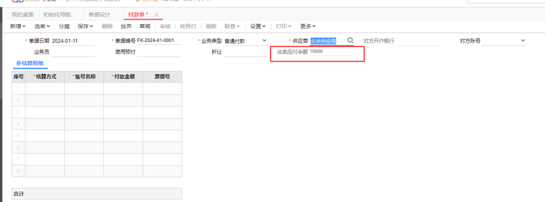 打開付款單-可以看到付款單上有此前應(yīng)付余額。