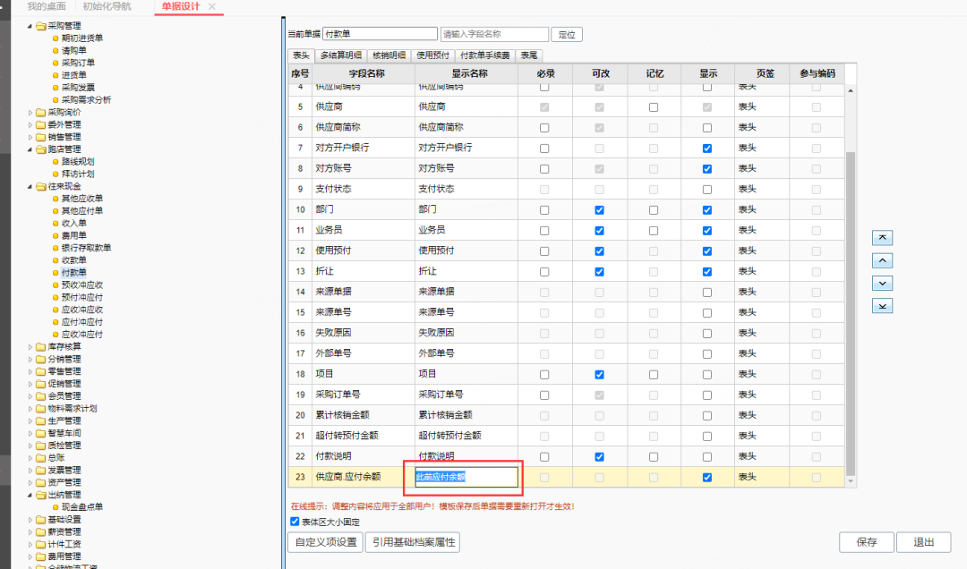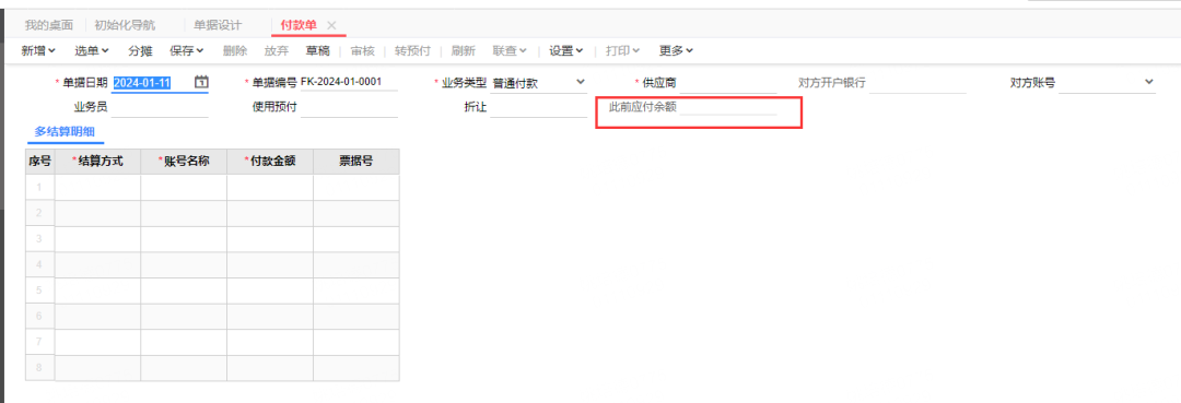 【問題現(xiàn)象】為了方便客戶進(jìn)行資金安排,需要在付款單中顯示供應(yīng)商的此前應(yīng)付余額,以便客戶了解還有多少款項尚未支付。 【解決方案】系統(tǒng)管理-單據(jù)設(shè)計
