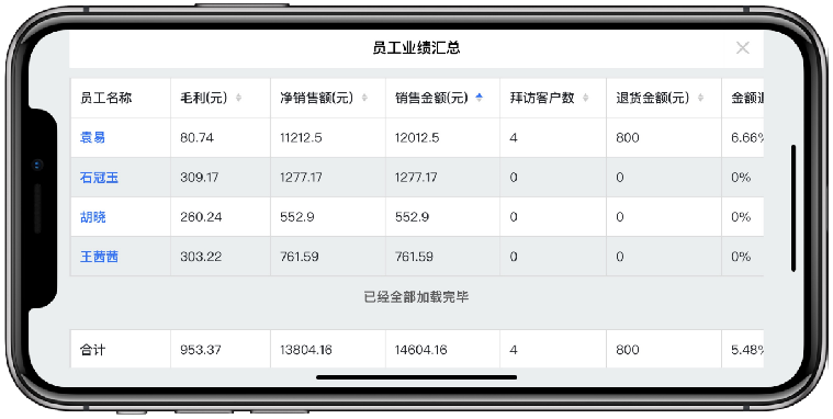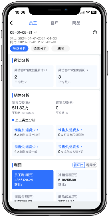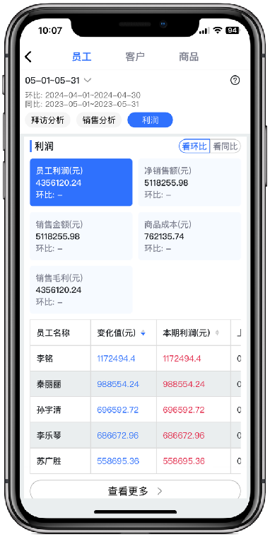 5. 新增職員分析報(bào)表,支持查看員工拜訪統(tǒng)計(jì)、員工銷售業(yè)績、利潤、凈銷額、毛利、銷售成本,同比環(huán)比表現(xiàn),并支持穿透查詢關(guān)聯(lián)數(shù)據(jù)